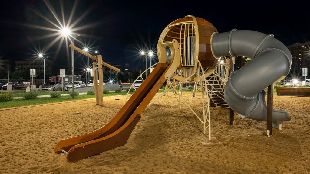На площадке есть игровой комплекс с горкой, несколько видов качелей, и тренажеры, нацеленные на игру с вестибулярным аппаратом. Детям предстоит попробовать удержать равновесие, исследовать «космический корабль» с горкой и отдохнуть на качелях-гамаках. В игре с балансом неизбежны падения, поэтому на площадке покрытие из песка.