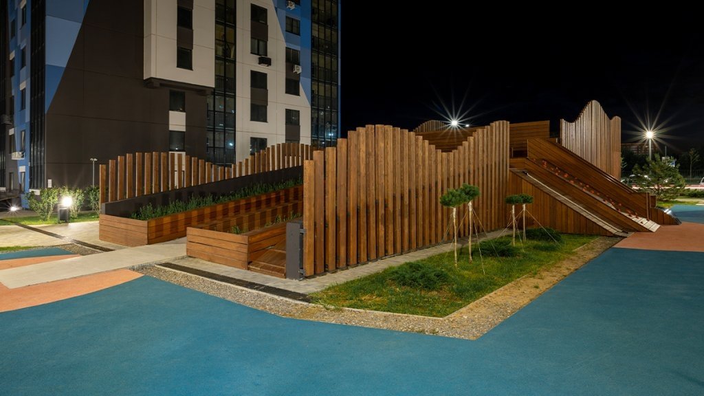 Исследуя опыт заграничных коллег, мы оборудовали крышу рампы въезда в подземный паркинг в полноценную горку. Забраться на нее можно 4 способами: по ступенькам, взобравшись по канату или преодолев тропу скалолаза. Рядом с ней мы расположили игровые элементы для развития навыков скалолазания.
