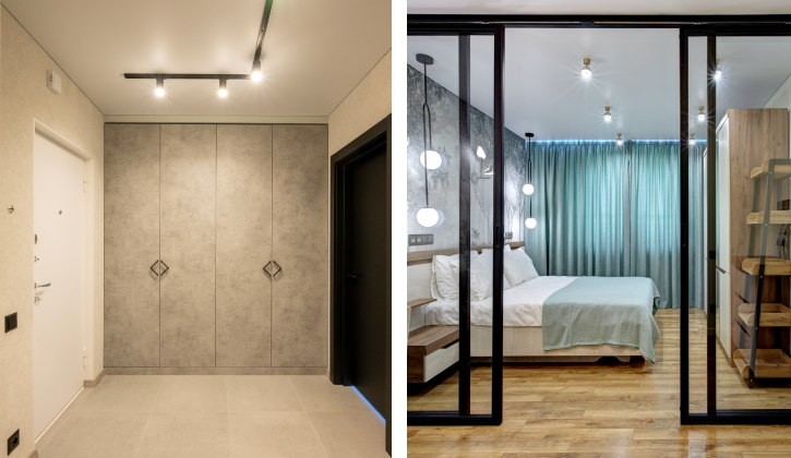Рекомендуем обратить внимание на встроенные шкафы, которые вместят в себя все необходимые вещи и станут стильным элементом в коридоре. Кстати, ниши под такие шкафы есть в квартирах ЖК «Космос 2.0»! Часть просторной спальни можно зонировать под уютную гостиную или рабочий кабинет, используя раздвижные дверцы и перегородки.